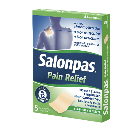 Salonpas Pain Relief, 105 mg / 31,5 mg, Emplastro Medicamentoso contém salicilato de metilo e levomentol. Indicações terapêuticas: Para o alívio sintomático da dor muscular e das articulações associada a entorses e distensões. Posologia e modo de administração: Aplicar 1 emplastro na zona afetada e mantê-lo até 8 a 12 horas. Se a dor reaparecer 8 a 12 horas depois da aplicação do primeiro emplastro, um segundo emplastro pode ser aplicado. Utilizar apenas 1 emplastro de cada vez. Não utilizar mais do que 2 emplastros por dia. Não utilizar mais de 3 dias seguidos. Não é recomendado para utilização em crianças e adolescentes com menos de 18 anos de idade. Contraindicações: Alergias às substâncias ativas ou a qualquer outro componente deste medicamento; Alergias ou histórico de alergias ou ataques de asma, especialmente quando toma outros analgésicos, medicamentos para reduzir a febre ou outros anti-inflamatórios não-esteroides (AINEs); Toma de medicamentos semelhantes para aliviar a dor; Problemas graves de coração; Problemas graves de rins ou de fígado; Úlceras hemorrágicas ou problemas hemorrágicos; Terceiro trimestre de gravidez; Crianças e adolescentes com menos de 18 anos de idade. Precauções especiais: úlcera/hemorragia gástrica ou uma história de úlcera gastrointestinal (do estômago) ou de dispepsia crónica (desconforto após as refeições ou azia); asma; idosos; uso prolongado ou repetido do medicamento Data de revisão do texto: 04/2024 Medicamento Não Sujeito a Receita Médica. Leia cuidadosamente as informações constantes do folheto informativo e em caso de dúvida ou persistência dos sintomas, deve consultar o médico ou farmacêutico. 2508PWSAL023 | Laboratórios Azevedos - Indústria Farmacêutica, S.A., Estrada da Quinta, 148, Manique de Baixo, 2645-436 Alcabideche NIF 507 474 287